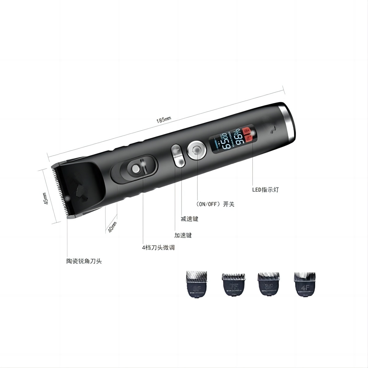 • صفحه نمایش به طور مستقیم تنظیمات 5 سرعته را نشان می دهد، که امکان تنظیم انعطاف پذیر بر اساس تراکم موی حیوان خانگی را فراهم می کند و به راحتی حتی موهای ضخیم را برش می دهد.
